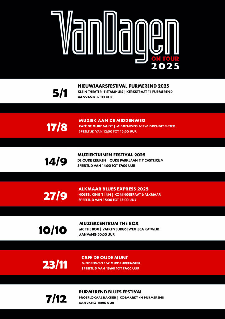 VanDagen is een geroutineerde Nederlandse band spelend met plezier, energie en passie. De band wordt gevormd door Ruud (gitaar), Willem (drums), Laurens (basgitaar) en Gino (zang).